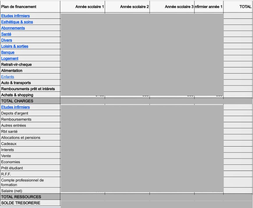 Voici un exemple de plan de financement réalisé avant ma première année en école d'infirmiers